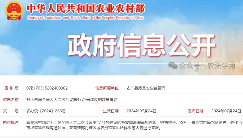 农业农村部高度重视农资质量问题,持续加强互联网农资经营管理。种子方面,在春耕和秋冬种用种关键时期,督促有关电商平台加强网络售种资质查验。农药方面,严格落实农药经营许可制度,强化线上线下一体化经营,明确限制使用农药不得利用互联网经营。兽药饲料方面,组织开展饲料和饲料添加剂产品、兽药产品监督抽查检查等工作,完善兽药追溯监管。