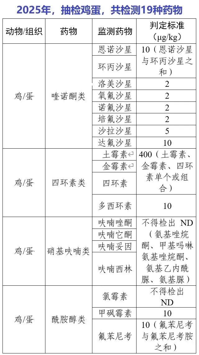 从公布的清单里可以看到,2025年主要抽检鸡蛋中是否含有4大类、19种药物。