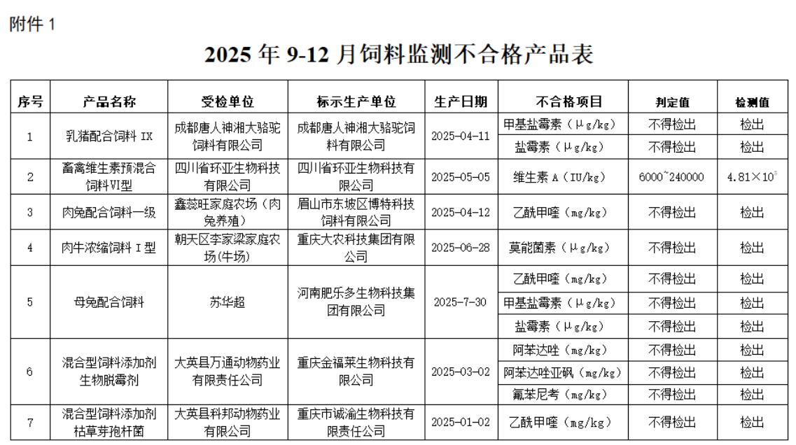 近期四川省发布的2025年9-12月饲料质量安全监督抽检通报,再次敲响行业警钟。通报显示,抽检饲料检出多项不得检出的违禁成分,同时存在维生素A等物质超标问题。